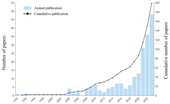 Based on an analysis of the number of publications from 1992 to 2023, we found that the publication rate is on the rise (Figure 2). Based on the increase in the overall momentum, there are three phases of the research in this field: