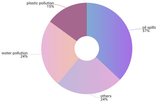 As illustrated in Figure 3, there are four primary categories of topics in the analyzed articles: oil spills, water pollution, plastic pollution (macro and micro), and others. Oil spill management has the highest concentration of applications of AI in addressing MP. This observation suggests that AI technologies have largely been used to address the challenges associated with oil spills, which indicates the urgency and severity of these incidents. Water pollution applications follow oil spill management as the second most prevalent category of applications. Historically, oil spill mitigation efforts have been prioritized due to their immediate ecological and economic consequences, which may explain this discrepancy. Water pollution sources are complex and dynamic, while oil spills are more localized and well defined. This may pose challenges for the use of AI in water pollution control. In comparison, the field of plastic pollution exhibits the lowest number of applications of AI. Detecting and addressing plastic pollution is likely to be challenging for AI algorithms due to the variety of plastic sources, sizes, and types. Moreover, the persistent nature of plastic waste and its global distribution require interdisciplinary and holistic approaches beyond the use of traditional AI technologies. Lastly, AI is also used to detect pollution caused by ship operations and monitor the response of marine organisms to MP.
