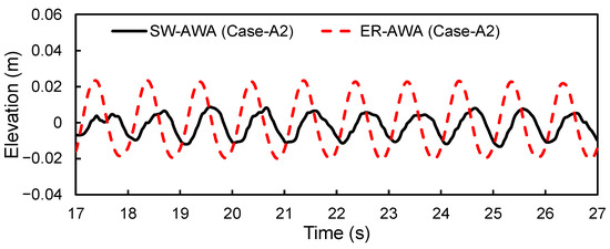 Table 4 displays the separation results obtained utilizing the 4-point method. It is evident that the RC values for waves generated by the SW-AWA method range from no less than 47% to as high as 96%. In contrast, the RC values for waves generated by the ER-AWA method do not exceed 5.80%. Representative simulated water elevations for Case A2, Case B3, and Case C3 are illustrated in Figure 6.