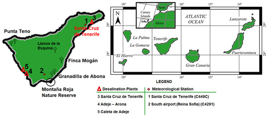 Currently, there are 29 reverse osmosis (RO) seawater desalination plants (EDAM) in Tenerife. The most important plants by water production capacity are shown in Table 1, two of which are located in the south of the island and the other in Santa Cruz de Tenerife, the island’s capital. Figure 1 shows the locations of these three desalination plants in Tenerife [10].