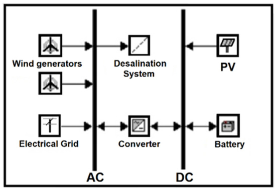Taking these objectives into account, firstly, the sizes of the possible elements of the RES to power the desalination plant need to be selected. The HOMER software was selected to achieve the most satisfactory design. This software can carry out the simulation, optimization, and sensitivity analyses of the RES (PV-Wind) to determine the energy needs of the desalination plants in question [6]. Figure 2 shows the suggested RES for the simulation. These devices can involve PV modules in combinations of various wind turbines, all connected to the electrical grid.