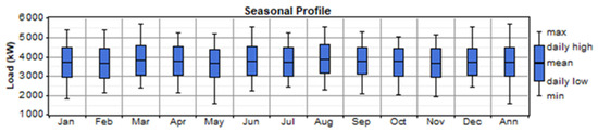 In order to carry out this research, it was assumed there would be a desalination plant with a production of 20,000 m3/day, with a possible energy expenditure of 4.50 kWh/m3 of desalted water; these values were taken based on the technical operation of different plants in the island set out in Table 1 and in specialized literature such as [10]. According to HOMER, the energy consumption of the installation can reach 89,500 kWh/day. The average electricity demand will be 3729 kW, which may increase to 5688 kW at peak hours. Figure 3 displays the annual distribution of electrical energy consumed, the average, and the minimum and the maximum consumption per month.
