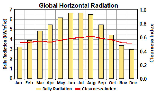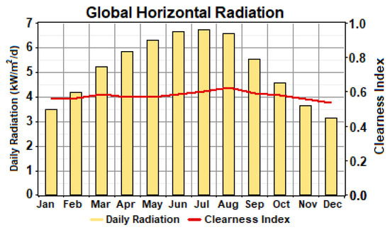 The HOMER computer software processes solar radiation for each hour of the year with the Graham algorithm, both for simulation and optimization. Figure 4 and Figure 5 show the average solar radiation each month over a year at the selected coordinates, at meteorological stations C4291 and C449C. The annual solar average scaled at the selected points is 5.16 kWh/m2/d for the South Airport and 4.99 kWh/m2/d for the Santa Cruz de Tenerife Meteorological Station.
