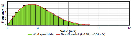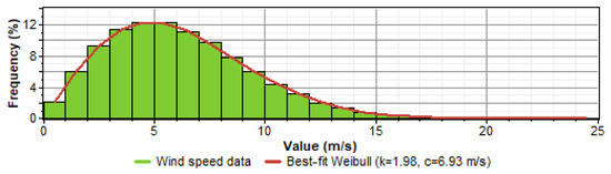 The monthly average wind speeds were taken from the two meteorological stations whose coordinates are shown in Table 2. The first one, located at the Reina Sofia Airport, has a database of more than 35 years and an average annual wind speed of 6.1 m/s. The second is located in Santa Cruz de Tenerife, where the average annual wind speed is 3.0 m/s according to figures dating back over 85 years. The simulation performed by HOMER uses the Weibull probability density function, which is stated as follows [3,6,11]. The Weibull distributions for meteorological stations C4291 and C449C are shown in Figure 6 and Figure 7.