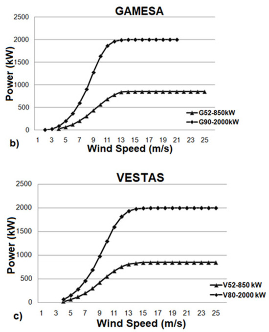 Power curves of the wind generators. (a) Enercon, E48-800 kW and E82-2.0 MW; (b) Gamesa, G52-850 kW y G90-2.0 MW; (c) Vestas, V52-850 kW y V80-2.0 MW (Source: [40,41,42,43,44]).