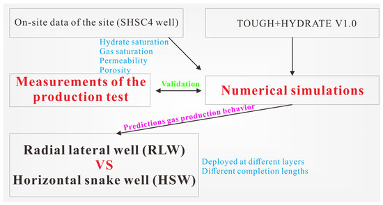 Taking China’s first offshore NGH testing production as an example, the NGH development simulation software TOUGH + HYDRATE V1.0 was adopted to establish an ideal interlayer heterogeneity model based on SHSC4 well logging curve data. The gas production data of the site was fitted to verify the reliability of the numerical model. This work predicted and compared the gas and water production behavior of RLW and HSW with different completion lengths when they deployed at different layers, with a fixed production pressure difference of 6 MPa and continuous production for 360 days. The methodology flow chart is shown in Figure 1.