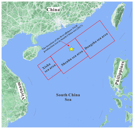SHSC well site location [14]. (Adapted with permission from Hao, et al. Dynamic analysis of exploitation of different types of multilateral wells of a hydrate reservoir in the South China sea. Energy & Fuels 2022, 36, 6083–6095., Copyright 2022 American Chemical Society.).