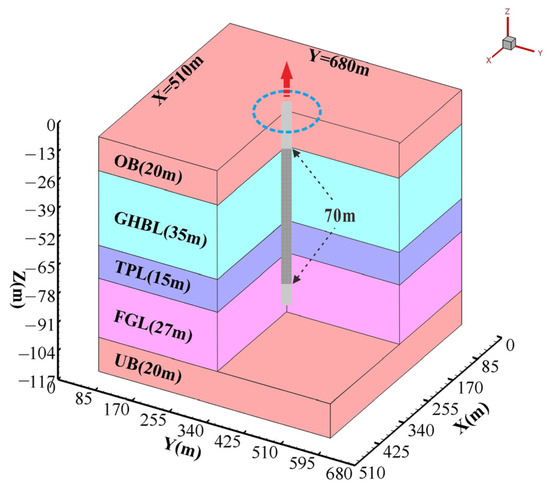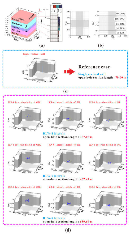 GHBL, TPL, and FGL were initialized as individual subdomains, and the key was to maintain consistent heat flux between the contact surfaces of the subdomains. Finally, we combined the initialized subdomains as shown in Figure 4 [34,35,36,37] and set fixed temperatures and pressures at the top and bottom of the model to establish Dirichlet boundary conditions [38]. When the RLW and HSW were deployed at the middle of three layers, respectively, the production pressure difference between the wellbore grids and the reservoir was set to 6 MPa. In this work, the wellbore radius of the single vertical well was set to be 0.1 m, and the RLW and HSW were set to be 0.05 m [25].