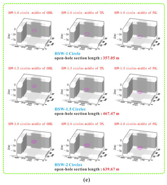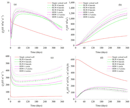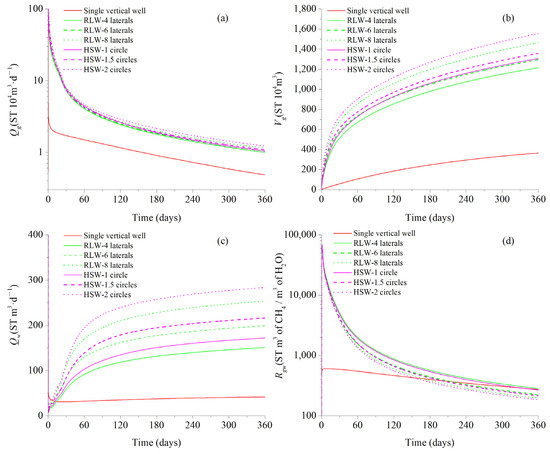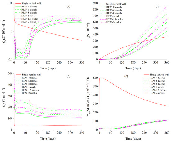 Figure 11a,b shows the variation curves of Qg and Vg with different RLW and HSW design deployments at the middle of FGL. After about eight days of depressurization, the Qg of these two well types suddenly increased with the free gas from TPL entering the wellbore and gradually decreased with the weakening of the driving force. After 360 days of depressurization, the Vg of RLW-4 laterals, RLW-6 laterals, RLW-8 laterals, HSW-1 circle, HSW-1.5 circles, and HSW-2 circles were 1027.71 × 104, 1141.27 × 104, 1303.45 × 104, 1148.70 × 104, 1303.45 × 104, and 1396.74 × 104 ST m3, compared to the single vertical well, increased by 281.29%, 312.38%, 356.77%, 314.41%, 330.46%, and 382.30%, respectively. Similar to the wells deployed at GHBL and TPL, the overall production capacity of HSW well was better than that of RLW and the production capacity of HSW-1 circle was better than that of RLW-4 and RLW-6 laterals again. Figure 11c,d shows the variation curves of Qw and the Rgw. Compared with the well types deployed at GHBL and TPL, the well types deployed at FGL had a slightly higher water production rate because it had a higher water saturation of about 93%, and their Rgw was ultimately stable at around 100 to 200. Table 7 shows the gas production of these well types.