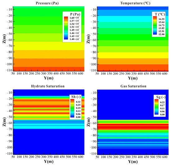 The single vertical well was deployed at the center of the model with a length of 70 m, the completion interval was −201 to −271 mbsf (consistent with the model’s −21 m to −91 m), and the wellbore grid had a production pressure difference of 3 MPa [44]. The position of the vertical well is shown in Figure 5.