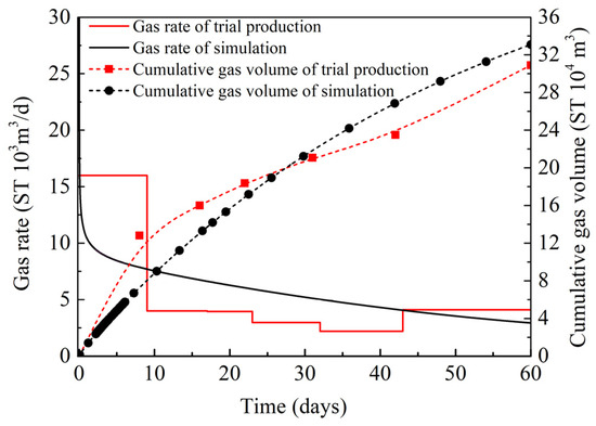 Figure 6 shows the fitting results of gas production. It can be seen that the fitting results of simulated gas production and trial production data were within an acceptable range. According to the fitting results, this model can serve as the basic model for subsequent research.