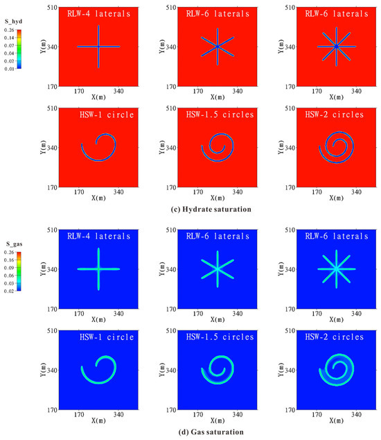Figure 9a,b shows the variation curves of Qg and Vg with different RLW and HSW design deployments at the middle of TPL. The Qg of these two well types gradually decreased after reaching its peak value in the initial stage. Even so, its Qg and Vg were the highest compared to the well types deployed at GHBL and FGL, which was because it can simultaneously recover hydrate dissociation gas from GHBL and free gas from TPL and FGL. Wan et al. also found the same results in previous studies [29]. After 360 days of depressurization, the Vg of RLW-4 laterals, RLW-6 laterals, RLW-8 laterals, HSW-1 circle, HSW-1.5 circles, and HSW-2 circles were 1215.12 × 104, 1294.38 × 104, 1356.88 × 104, 1305.72 × 104, 1463.54 × 104, and 1554.73 × 104 ST m3, compared to the single vertical well, increased by 332.59%, 354.29%, 400.58%, 357.39%, 371.39%, and 425.54%, respectively. The results showed that the well types deployed at TPL had excellent production performance. It is worth noting that, similar to the wells deployed at GHBL, the overall production capacity of the HSW well was better than that of RLW, especially the production capacity of the HSW-1 circle was better than that of RLW-4 and RLW-6 laterals. This may be due to the smaller distance between the wellbore of HSW with spiral distribution, resulting in a larger range of pressure superposition and stronger synergistic production effects between wellbore. In this case, the reservoir at the root of the RLW laterals wellbore formed a certain amount of secondary hydrates, as shown in Figure 10c. Figure 9c,d shows the variation curves of Qw and Rgw. When these well types were deployed at TPL, their Qw was slightly lower overall compared to those deployed at GHBL and FGL. This was because a lot of free gas entered the wellbore, which affects water production; their Rgw was ultimately stable at around 200. Table 6 shows the gas production of these well types.