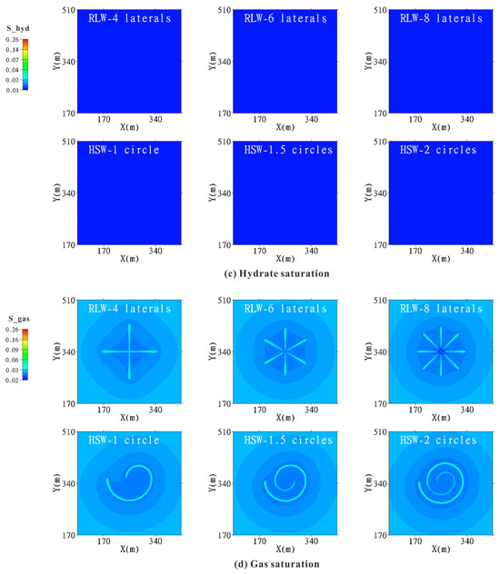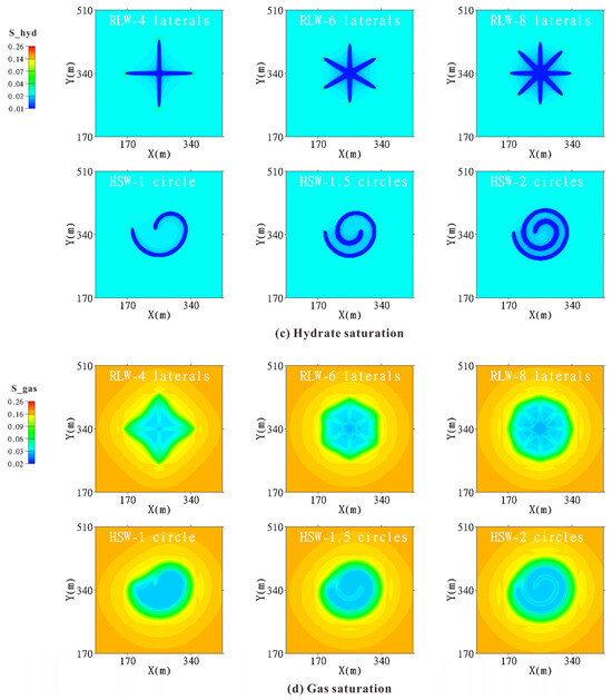 Due to the superimposed pressure drop, the internal wellbore of HSW and the intersection of laterals in RLW had larger pressure drop areas (Figure 12a). Compared with the well types deployed at GHBL and TPL, the gas expansion effect weakened pressure propagation when the well types deployed at FGL. There were no low-temperature areas or secondary hydrates formed around the wellbore (Figure 12b,c), which was because FGL has a higher formation temperature. Additionally, a low saturation of free gas accumulated around these well type’s wellbores (Figure 12d).