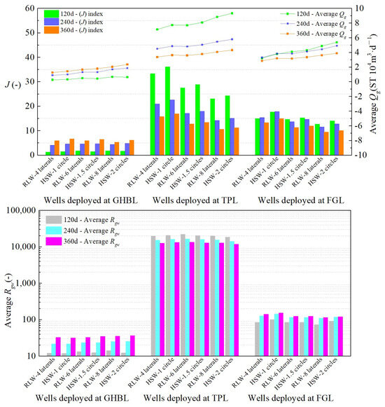 The average Qg and average Rgw are commonly used to evaluate production capacity. Figure 13 depicts the average Qg and average Rgw of these well types during the 360-day production period. When these well types are deployed at GHBL, the average Qg slowly increases with the dissociation of solid hydrates during production. Due to the synergistic pressure reduction effect between wellbores, the HSW well type performs better under the same completion length. When these well types are deployed at TPL or FGL, their average Qg decreases with production as the driving force weakens. Similarly, due to the synergistic pressure reduction effect between wellbores, the HSW well type performs better. In addition, these well types have the best average Rgw performance when deployed at the TPL. Due to the production capacity, they may not be completely proportional to the well length. Therefore, the specific production index J is adopted as a supplementary indicator, which is mainly affected by the well types and the definition is as follows [9]: