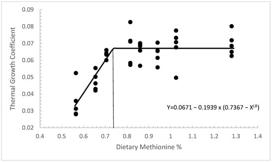 Statistical modeling has been used for several decades to determine nutritional requirements in several important species [51,52,53,54,55]. Model selection for the five growth parameters (PWG, MW, TGC, ANPR, MR) estimated a minimum dietary methionine requirement for Florida pompano of 0.68% (as-is basis). Previous data from the Auburn University aquatic animal nutrition lab confirm the obtained results (data not published). This would place the dietary methionine requirements of Florida pompano much lower than those of similar species of marine finfish, such as the silver pompano (1.16–1.18%) [56], as well as the golden pompano (1.06–1.27%) [57]. Wang et al. described most species possessing a methionine requirement between 0.49 and 2.50% of the diet, or 1.49 and 4.70% of dietary protein. Thus, the methionine requirements estimated from this study are within the expected range for a commercially important finfish species [18].