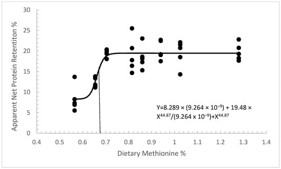Model fitting for PWG, MW, TGC, ANPR, and methionine retention (MR) are presented in Table 6. BLM1 was shown to be a good fit for MW (AICc = 184.223 and Akaike = 0.467) and TGC (AICc = −217.441 and Akaike = 0.432). The results of TGC being fitted with BLM1 show a methionine requirement of 0.74% with a range between 0.70 and 0.78% (Figure 1). AICc and Akaike weights demonstrate a goodness of fit for the model SKM-4 for PWG (AICc = 443.257 and Akaike = 0.422), as well as apparent net protein retention (AICc = 197.362 and Akaike = 0.688). The results of ANPR fitted to the SKM-4 model show a methionine requirement of 0.68% with a range of 0.68 and 0.72% (Figure 2). BQM was an overwhelmingly good fit for methionine retention (AICc = 246.94 and Akaike = 0.96) and predicted a methionine requirement of 0.76% with a range of 0.68 to 0.82% (Figure 3). R was unable to calculate AICc and Akaike weights for BLM 1 and BLM2 for methionine retention, as well as the requirements for BLM1, BLM2, and SKM-4. Estimates for methionine requirements were consistent across all models, with the exception of the SKM-4 calculation for methionine retention, which placed the value at 89%. Estimates calculated by BQM also placed methionine requirements higher than the other models, between 0.81 and 0.85% (Table 6).