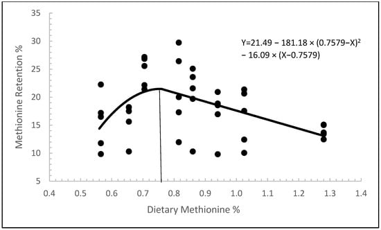 In general, retention levels of EAAs appear to follow a similar trend, where retention values increased up to the requirement for methionine, then plateaued. This is, in part, due to methionine having the ability to reduce the oxidation rates of other EAAs [17] as well as the imbalance of EAAs. Unlike the other AAs, which were not supplemented, higher levels of methionine resulted in a decrease in retention values. This is due to methionine being in excess within the diet and no longer being utilized efficiently within the body. Excess methionine impedes the transamination pathway that leads to its metabolism [58]. The diet that supported the highest level of methionine retention in the fish contained 0.82% methionine. While this is slightly higher than the projected requirement within the present work, it is still within the projected ranges shown by the SKM-4 model for PWG (0.686–1.367) as well as the BQM model for methionine retention (0.686–0.829). Using methionine as a benchmark, we can see that diets supplemented with 0.71% methionine had a retention efficiency of 24.61%. In the same diet, lysine (23.51%) and taurine (35.27%) also had high retention efficiencies. Typically, a high retention value indicates that they are close to the requirement; hence, these are the most limiting AAs. The next numerically high retention value was that of threonine, which would indicate that it is likely the next most limiting AA within this dietary matrix and a requirement should be pursued.