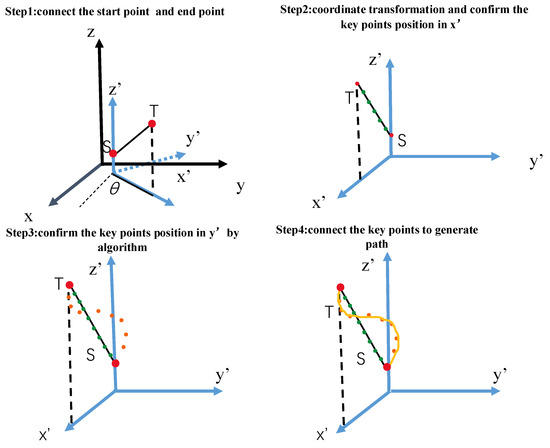 To address the path planning problem, a Cartesian coordinate system can be established and in determining the starting point (S) and the target point (T) of the UAVs in the space, the path of the UAV flight is determined by a specific number of key points in the space [44]. Define ST as the line connecting S point and T point. To reduce computational complexity and the number of decision variables for the algorithm, coordinate transformation is applied to this space. Assuming n key points are uniformly distributed along ST, segmenting ST into n + 1 intervals, and the x’-axis is fixed to the projection of the Oxy-plane of the ST through the coordinate transformation, the key points are considered to be uniformly distributed in the transformed x’-axis in x component, then the coordinates of the key points in the direction of the x’-axis can be determined by the starting and target points as well as by the number of key points. After this transformation, the optimization algorithm only needs to locate the y’ and z’ components of n key points within the constraints to determine the key points’ positions. Connecting all key points generates a path; this procedure is shown in Figure 1. The path planning problem in 2D space can be regarded as the result of projection of 3D space to the Oxy plane.