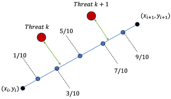 The threat cost function () evaluates the threat posed to the UAV during its flight, which is based on the distance between five particular points in each segment and the center of the threat area. It is only calculated when the UAV enters a threat area; otherwise, it remains zero. When one of the segments enters the threat area, it is not enough to evaluate the threat level by only one point, and based on the former study [44], a more accurate threat level can be obtained by selecting five points for each segment of the path that enters the threat area to assess the threat level. The severity of threat () in each threat area is determined according to the threat area. The threat cost function is formulated as follows: