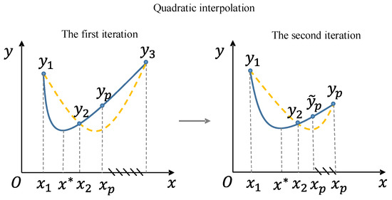 After the exploration and exploitation by WSO, the population can be further optimized, and quadratic interpolation (QI) modules are added. The QI operator is a method that enhances the ability of individuals to interact, further exploiting the population’s ability to mine local information. Based on the information of neighboring individuals, interpolation points are generated to deepen the exploration of known local information. When conducting quadratic interpolation on excellent individuals, it can more comprehensively explore the positions near excellent individuals, thereby searching for potentially better positions. When conducting quadratic interpolation on inferior individuals, it can drive them closer to excellent individuals and explore more valuable search ranges. The mathematical core of quadratic interpolation is to construct a parabolic fit of the objective function based on three known points, and approximate the extreme points of the objective function through the extreme points of the parabola, thereby quickly finding possible optimal values [49]. Figure 6 shows the core idea of the QI operator.