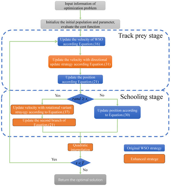 However, the complexity of problems in the maritime environment, exacerbated by the influence of complex sea winds, imposes higher demands on optimization algorithms, necessitating an enhancement in the search capabilities of WSO populations. There are still some places where WSO can be improved. For instance, in guiding the velocity using individual recorded best values, WSO relies entirely on random individuals, which may not fully exploit the information from individual records, particularly for individuals with less favorable results that warrant stronger optimization behavior. During the fish schooling stage, if the white shark’s visual abilities are insufficient to track the optimal fish, it remains stationary, resulting in missed opportunities to exploit the solution space.