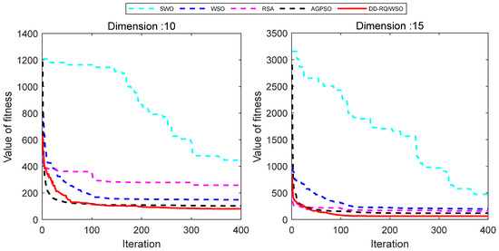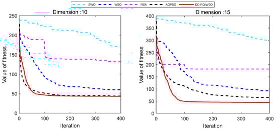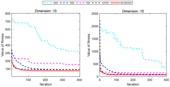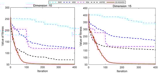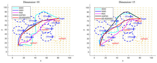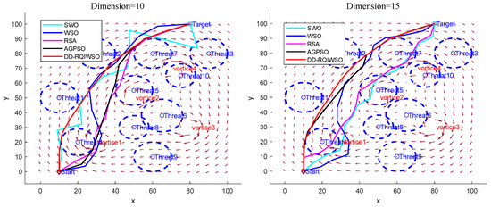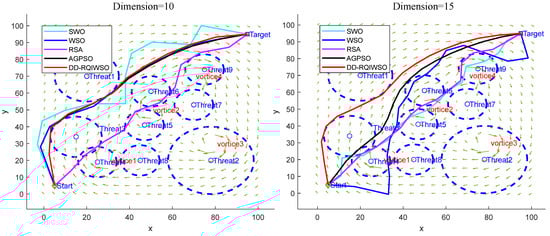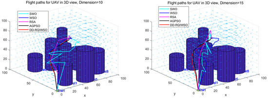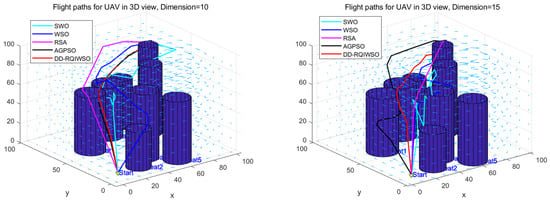 Figure 14 exhibits the convergence curves of results of the algorithms. The convergence characteristics of the DD-RQIWSO algorithm excel in comparison to the other algorithms, which can be proved by Figure 14. The convergence accuracy of AGPSO algorithm is little faster than DD-RQIWSO before 15 generations; it also slows down and falls into local optima after that. There is no doubt that the proposed algorithm obtains the optima solution at the fastest accuracy. The flight paths of the UAVs generated by each algorithm in a 3D environment are shown in Figure 15. As shown in the figure, the path of DD-RQIWSO algorithm obtains the optimal path with respect to the other compared algorithms. The flight path of DD-RQIWSO algorithm follows a smooth path. It avoids all threats as it takes advantage of wind. The path generated by WSO becomes tortuous and follows an unwarranted route. The flight path of RSA algorithm provides higher flight attitude in the 15 dimension and increases flight distance in the 10 dimension. SWO’s path twists the route and goes through the threat region usually. The path of AGPSO follows long routes when dimension increases, and loses the ability to consider the effect of the environment.