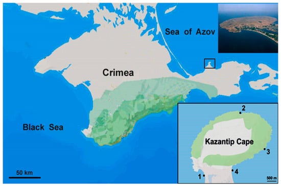 Map of the sampling sites of the Kazantip Cape in bays 1—Russkaya, 2—Shirokaya, 3—Kunushkay, and 4—Tatarskaya.