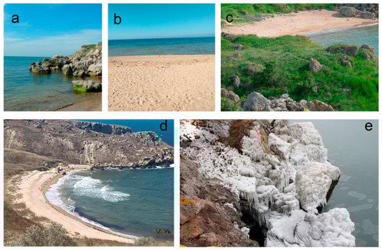 Various views of the Kazantip Cape and its bays: (a,d,e)—rocky cliffs; (b)—sandy coast of Russkaya Bay; (c)—Kunushkay Bay; (d)—Shirokaya Bay; (e)—coastal ice cover.