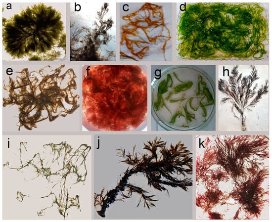 Samples of the macroalgae of the coastal waters of the Kazantip Cape: (a)—Bryopsis hypnoides, (b)—Callithamnion corymbosum, (c)—Cladosiphon mediterraneus, (d)—Ulva intestinalis, (e)—Polysiphonia denudata, (f)—Pyropia leucosticta, (g)—Ulva linza, (h)—Ericaria crinita, (i)—Cladophora liniformis, (j)—Gongolaria barbata, and (k)—Ceramium arborescens.