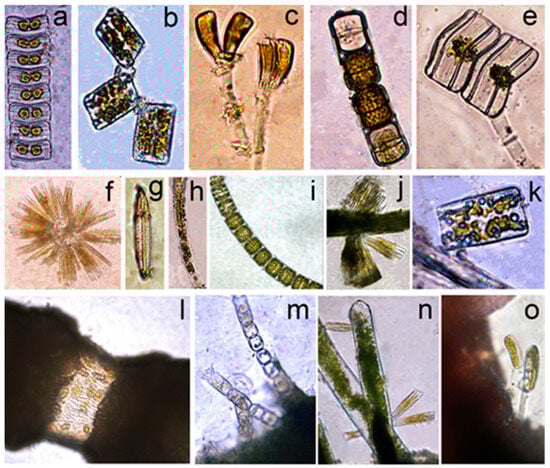 Among the diatoms noted in our list of species, there are obligate foulers, Achnanthes, Licmophora, Tabularia, Gomphonemopsis, Rhoicosphenia, Striatella, etc., capable of adhesion with the help of mucopolysaccharides they secrete [41,42], as well as species that move freely along the substrate.