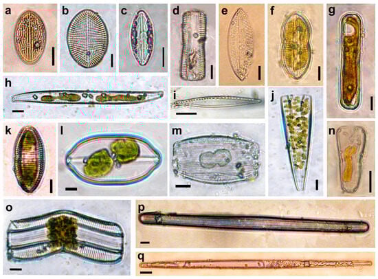 LM. Photographs of some diatom species frustules (a–e,g,i,p,q) and cells with chloroplasts (f–h,j–o) on macroalgae epiphyton: Cocconeis placentula var. euglypta (a), Cocconeis scutellum (b), Mastogloia pumila (c), Navicula cancellata (d), Navicula palpebralis (e), Diploneis didyma (f), Caloneis liber (g), Nitzschia sigmoidea (h), Nitzschia lanceolata var. minor (i), Licmophora abbreviata (j), Achnanthes brevipes (k), Petroneis humerosa (l), Undatella lineolata (m), Gomphonemopsis pseudexigua (n), Achnanthes longipes (o), Synedrosphenia crystallina (p), and Tabularia tabulata (q). Scale bar: 10 µm.
