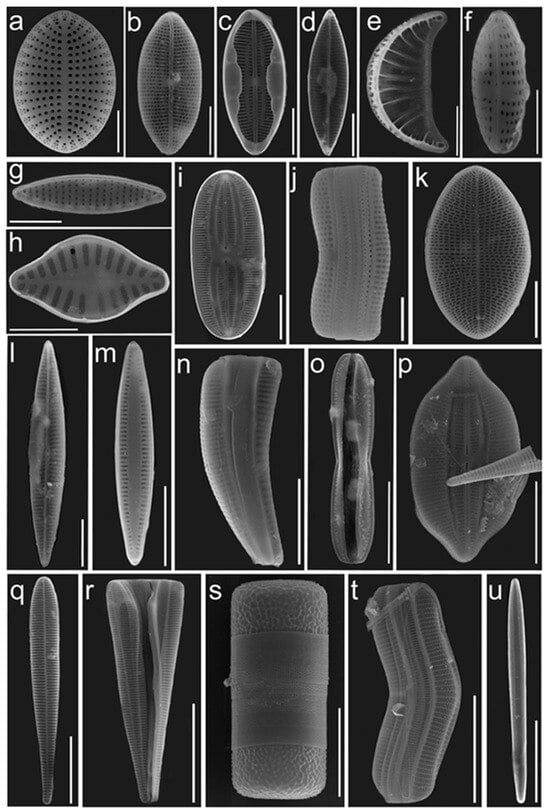 SEM. Some species of diatoms found in the macroalgae epiphyton of the Kazantip Cape coastal waters are as follows: Cocconeis scutellum (a), Mastogloia pumila (b,c), Navicula dumontiae (d), Rhopalodia musculus (e), Navicula perminuta (f), Nitzschia inconspicua (g), Planothidium delicatulum (h), Fallacia forcipata (i), Achnanthes brevipes (j), Cocconeis placentula var. euglypta (k), Haslea subagnita (l), Tabularia parva (m), Rhoicosphenia marina (n), Nitzschia hybrida f. hyalina (o), Lyrella atlantica (p), Licmophora abbreviata (q,r), Melosira moniliformis (s), Achnanthes longipes (t), and Tabularia tabulata (u). Scale bar: (a–e) = 5 µm; (f,g) = 3 µm; (h) = 4 µm; (i–n) = 10 µm; (o–q) = 20 µm; (r,s) = 30 µm; and (t,u) = 40 µm.