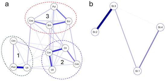 JASP plot of the full diatom community similarity in submerged macroalgae (a) and in four studied sites in the coastal waters of the Kazantip Cape of the Sea of Azov (b). Macrophyte names were coded as in Appendix A Table A1. The line thickness reflects the similarity coefficient value. The red lines are negative, and blue lines are positive correlations. Different clusters are numbered 1–3.