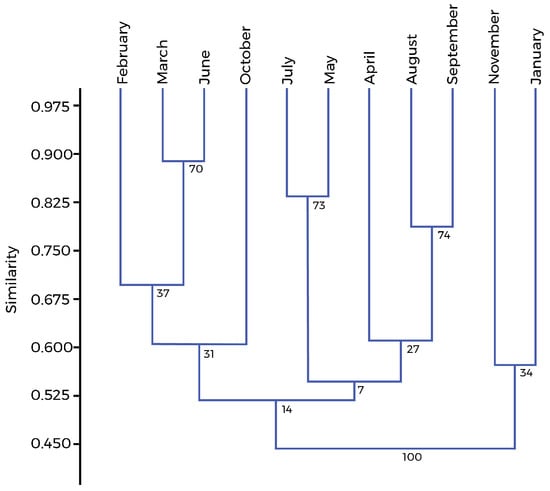 The similarity of the species composition of diatoms of macroalgae by month, calculated using the Bray–Curtis index (BC) in the Past 4.03 program, turned out to be close to 0.45 (Figure 8). This indicated a certain similarity in the species composition on the epiphyton diatom community throughout the year. There were seven species (Achnanthes brevipes, Berkeleya rutilans, Cocconeis scutellum, Grammatophora marina, Melosira moniliformis, Navicula ramosissima, and Tabularia tabulata) that occur monthly on macroalgae.