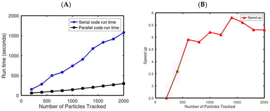 Comparison of run time of serial and parallel codes for tracking Lagrangian particles with particles varying between 200 and 2000 (A) and speed-up achieved through parallelization of Lagrangian tracking algorithm (B).