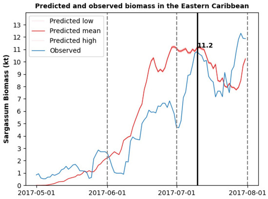 Predicted (red line) and observed sargassum biomass (blue line) in the Eastern Caribbean for the period May–August 2017. The black line indicates the predicted biomass of 11.2 kt for 10 July 2017.