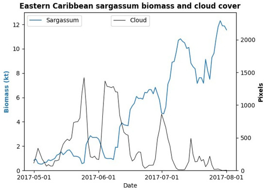 Comparison of detected cloud cover (black line) and sargassum biomass (blue line) from satellite imagery for the period May–August 2017.