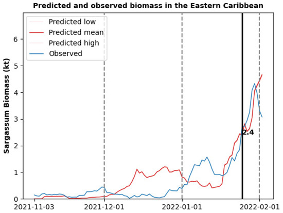 Predicted (red line) and observed sargassum biomass (blue line) in the Eastern Caribbean for the period November 2021 to February 2022. The black line indicates the predicted biomass of 2.4 kt for 25 January 2022.