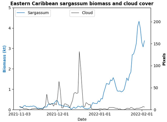 Comparison of detected cloud cover (black line) and sargassum biomass (blue line) from satellite imagery for the period November 2021–February 2022.