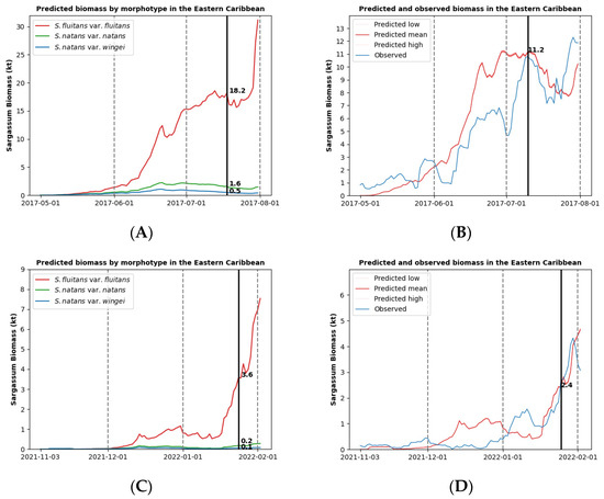 Comparison of biomass predictions for three morphotypes (left) and single-morphotype prediction and observation (right) for the period 1 May–1 August 2017 (A,B) and 3 November 2021–3 February 2022 (C,D). The black line indicates predictions for (A), 10 July 2017, 20.3 kt (S. fluitans var. fluitans—18.2 kt, S. natans var. natans—1.6 kt, and S. natans var. wingei—0.5 kt), compared to (B) 11.2 kt and (C) 25 January 2022, 3.9 kt (S. fluitans var. fluitans—3.6 kt, S. natans var. natans—0.2 kt, and S. natans var. wingei—0.1 kt) compared to (D) 2.4 kt.