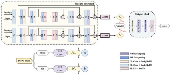 The network architecture of NUAM-Net. It consists of the feature extractor, PAdaIN, AUEM, and the output blocks. The extractor’s architecture is similar to the U-Net.