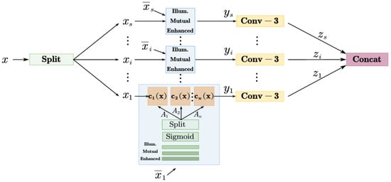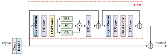 AUEM consists of two parts; the architecture is shown in Figure 3. Firstly, the features of LAB color space images are concatenated with those of the original images. Subsequently, they undergo a convolution to adjust the feature dimensions, followed by the AIEM (Adaptive Illumination Enhancement Module) [52], which consists of two components: Hierarchical Information Extraction (HIE) and IMAconv.