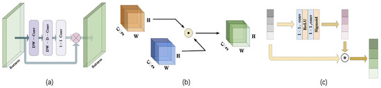 HIE employs three parallel operations: LKA, SG, and CA for feature extraction. Large-Kernel Attention, which is shown in Figure 4a, decomposes the feature extraction into three types of convolution: Depthwise Convolution (DW-conv), Depthwise Dilated Convolution (DW-D-Conv), and Point Convolution. DW-Conv is a 55 convolution, and DW-D-Conv is a 55 convolution with a dilation rate of 3. Point convolution is a convolution. DW-Conv processes local structural information, DW-D-Conv is used to capture long-range dependencies, and Point Convolution is used for inter-channel interaction. The Simple Gate (SG), which is shown in Figure 4b, divides the features along the channel dimension into two parts, decomposing into and . Then, these two features undergo a wise multiplication (the values at corresponding positions in two features are multiplied) operation. The channel attention-processed feature, which is shown in Figure 4c, passes through a channel attention module to obtain . Then, it passes through a convolution, followed by a ReLU activation function, and, subsequently, through another convolution with a Sigmoid activation function to produce feature . Finally, a wise multiplication operation is performed between and the original feature f to obtain the final feature.