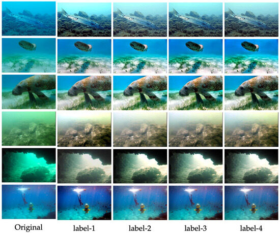 Examples of the extended UIEBD dataset, including 4 labels. Label-1 denotes the manually selected label in the original UIEBD dataset, label-2 is the contrast adjustment result, label-3 is the saturation adjustment result, and label-4 is the gamma correction result.