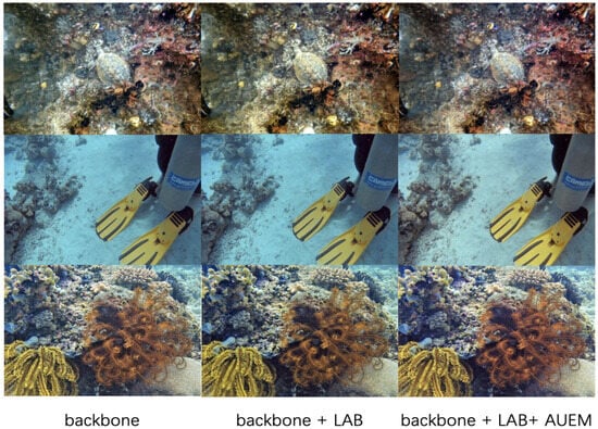 Enhancement examples of our ablation studies. We show the enhanced images of backbone, backbone+LAB, and backbone+LAB+AUEM on a subset of the UIEBD test data. It is evident from the image that our network demonstrates significant improvement in enhancement effectiveness.