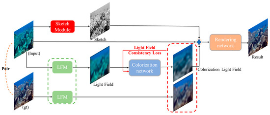 where represents the input underwater image, is the component of the illumination light, and R is the reflection component of the target object carrying the image detail information. Our method aims to improve the representation of underwater images by transforming the color of the underwater background light field, while preserving contour details. We present an overview architecture for underwater image enhancement in Figure 1. This architecture consists of four key modules: the sketch module, the light field detection module, the colorization network, and the rendering network. The input underwater image is processed through these modules to increase color representation and improve feature representation. The underwater image first passes through the sketch module and the light field detection module to generate three paths: the detail path, the original underwater image path, and the light field path. The light field path is then fed into the colorization network to obtain a restored color background light field. Also, image information is enhanced by tightly connecting the sketch path with the input image path and light field path. The combined images are then fed into the rendering network to obtain true-color underwater images. We will further explain the proposed method in the following subsections, including Section 3.1 (the light field detection module), Section 3.2 (the sketch module), Section 3.3 (the rendering network), and Section 3.4 (the loss function).