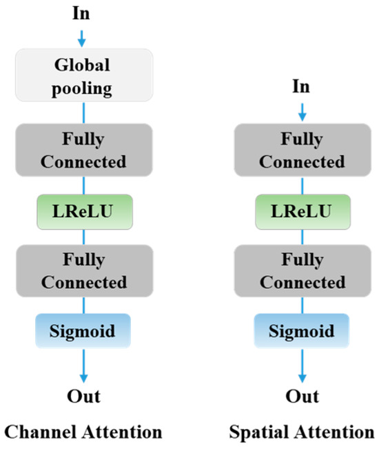 In the rendering network, in order to overcome the insufficiency of the underwater pairing dataset, we have also designed a U-Net-based network as our rendering network. In Figure 3, the properties of U-Net can be exploited to effectively train the network with only a small amount of data. To enhance the network’s performance further, we have integrated various attention modules. Considering the complex and diverse characteristics of underwater scenes, we first set the size of the convolutional layer to 1 × 1 and 3 × 3, using different receptive fields to obtain multi-scale features for fusion, while considering different spatial structures and color stabilization effects. We have also added a channel attention module and a spatial attention module, as shown in Figure 4. The channel attention module focuses on the network’s representation of significant feature channels. The spatial attention mechanism enables the network to focus on the complex light field distribution areas in the image and has a high attention ability. Residual connection is used to effectively prevent the vanishing gradient problem and improve the overall performance of the model.