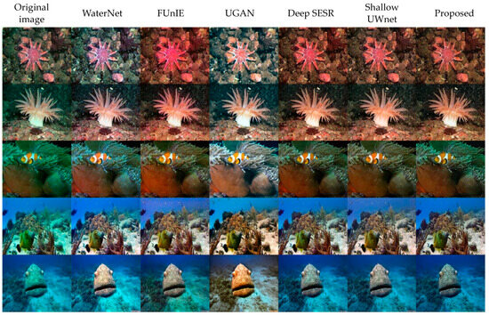 Seven state-of-the-art methods regarding underwater enhancement based on deep learning are used for comparison, which are UGAN [29], WaterNet [30], FUnIE [1], Deep SESR [31], Shallow-UWnet [32], URTB [33], and PUGAN [34]. In addition to quantitative comparisons, we also conduct qualitative evaluations with seven existing methods, to further show the superiority of our method.