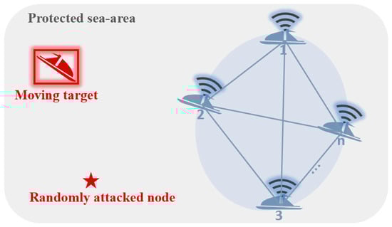 The pursuit scenario with ISVs pursuing a mobile target is presented in Figure 1. In accordance with this scenario, the constructed ZSSG model includes two players: the pursuit team, consisting of vehicles, and the moving target. Then, the ZSSG-based model for the multi-ISV target-pursuit scenario could be formulated by , where and denote the strategy sets for the two players. It should be noted that the red star in the figure represents the attached points of the moving target. Once the target reaches this point, the pursuit team fails the protection task. represents the payoff matrix for the pursuit team.