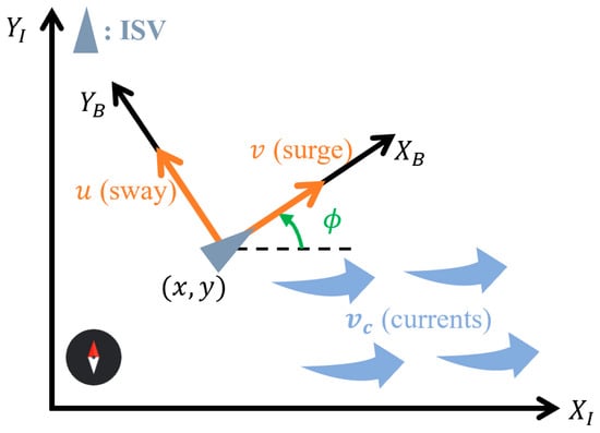 Before designing the maneuver strategy sets, the kinematic model of the surface vehicle should be formulated. When the vehicle moves on the surface, three primary types of motion on the horizontal plane are typically identified: surge, sway, and yaw. The corresponding motion analysis is presented in Figure 2. The motions of the vehicle are described using two reference coordinates: the geodetic reference coordinate and the vehicle body reference coordinate [33]. As shown in Figure 2, when , under , the position of the vehicle is . is the speed at which the vehicle oscillates left and right along , which is usually set to be zero. is the speed at which the boat oscillates forward and backward along . is the yaw angle of the vehicle. is the velocity of the currents at .